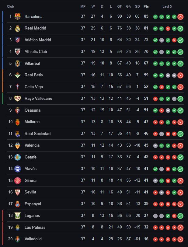 جدول نهایی لالیگا بعد از پایان هفته سی و هفتم رقابت‌ها را به شرح زیر است: