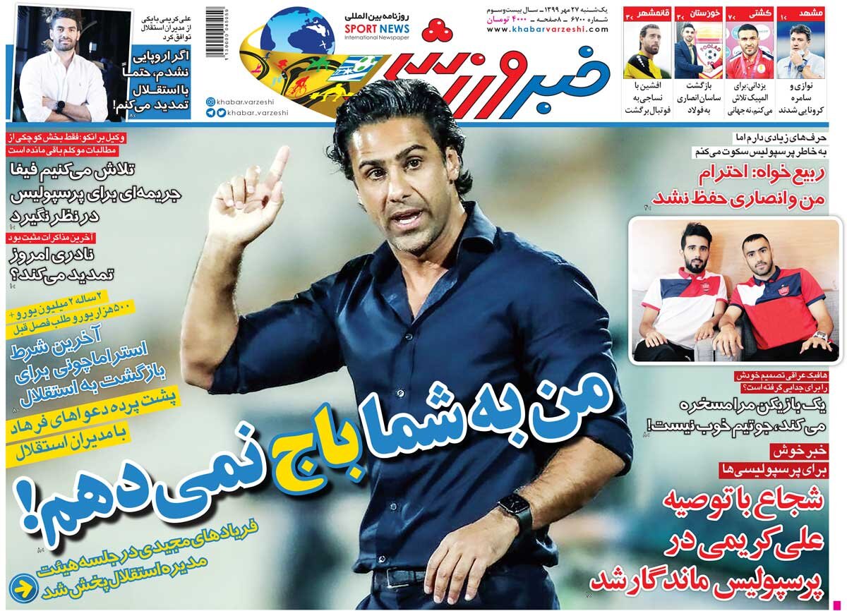 در شماره ۶۷۰۰ خبرورزشی میخوانید: پشتپرده دعواهای فرهاد با مدیران استقلال/ فریادهای مجیدی در جلسه هیئتمدیره استقلال پخش شد (ص۸)| وکیل برانکو: فقط بخش کوچکی از مطالبات موکلم باقی مانده است (ص۱)| آخرین مذاکرات مثبت بود؛ نادری امروز تمدید میکند؟ (ص۱)| آخرین شرط استراماچونی برای بازگشت به استقلال: ۲ ساله ۲میلیون یورو + ۵۰۰هزار یورو طلب فصل قبل (ص۸)| ربیعخواه: احترام من و انصاری حفظ نشد/ حرفهای زیادی دارم اما بهخاطر پرسپولیس سکوت میکنم (ص۴)| مرا مسخره میکند، جو تیم خوب نیست؛ هافبک عرافی تصمیم خودش را برای جدایی گرفته است؟ (ص۸)| خبر خوش برای پرسپولیسیها؛ شجاع با توصیه علی کریمی در پرسپولیس ماندگار شد (ص۱)| علی کریمی با یکی از مدیران استقلال توافق کرد؛ اگر اروپایی نشدم، حتما با استقلال تمدید میکنم! ( ص۸)