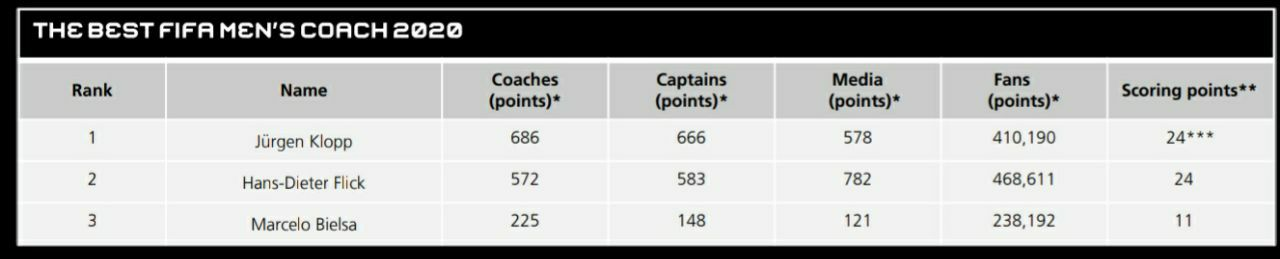 دلیل این که سرمربی لیورپول در رقابت با سرمربی بایرنمونیخ سبقت گرفت، تنها آراء بیشتر مربیان ملی به او بود. هردو مربی ۲۴ امتیاز کسب کردند، اما مربیان بیشتری به کلوپ رأی داده بودند و کاپیتانها بیشتر فلیک را انتخاب کردند.