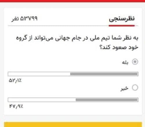 در نظرسنجی هفته گذشته سایت خبر ورزشی به وضوح شاهد بودیم که طرفداران فوتبال و دنبالکنندگان اخبار ورزشی با رای حداکثری امیدوار به صعود تیم ملی به دور دوم بوده و پیش بینیشان از نتایج سه دیدار این تیم راهیابی به دور بالاتر بود. اما در تازهترین نظرسنجی سایت خبر ورزشی با این پرسش که "پیش بینی شما از نتیجه دیدار ایران و ولز چیست؟" مخاطبان رأی حداکثریشان را به برد تیم ولز دادهاند!