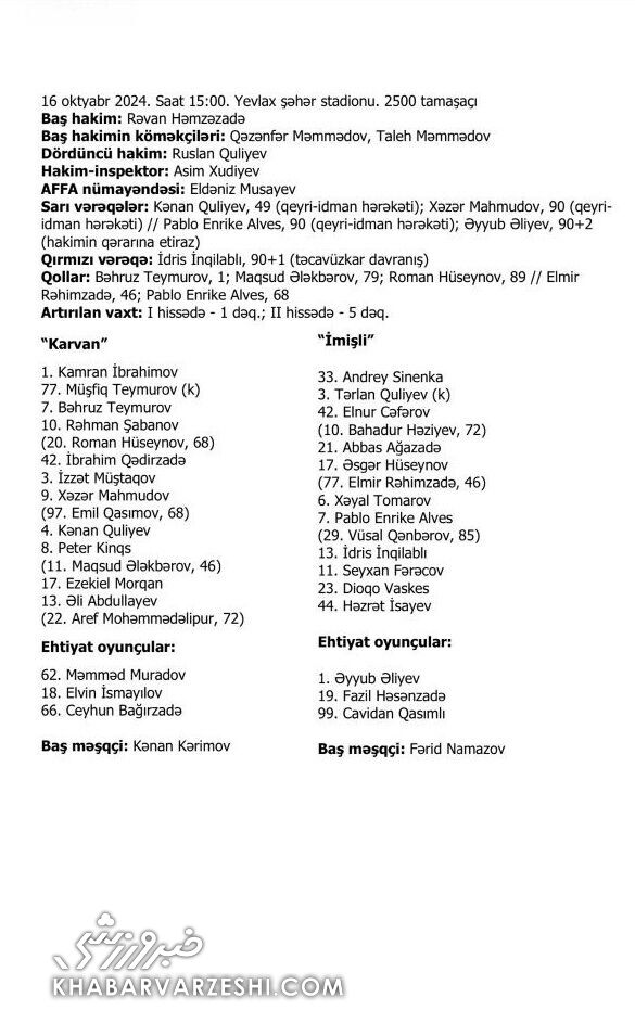 به گزارش خبر ورزشی، کاروان آذربایجان در هفته پنجم رقابتهای لیگ دسته اول آذربایجان، ایمیشلی تیم دوم جدول ردهبندی را با نتیجه ۳ بر ۲ شکست داد تا با ۱۵ امتیاز صدرنشینی خود را تداوم ببخشد.