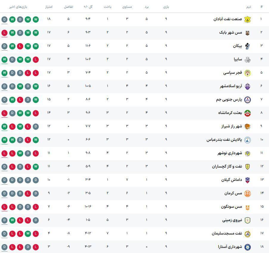 در آخرین مسابقه هفته نیز صنعت نفت آبادان با داماش گیلان به نتیجه مساوی رسید تا به لطف شکست مثل شهربابک، با اتکا بر همین یک امتیاز، ۱۸ امتیازی شده و صدر جدول را مال خود کند. مس شهربابک، پیکان و سایپا هم در رتبههای دوم تا چهارم قرار دارند