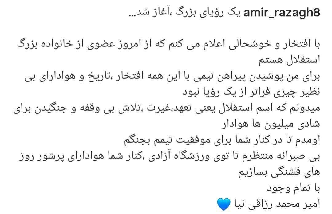 رزاقینیا دقایقی قبل در پستی اینستاگرامی نوشت: برای من پوشیدن پیراهن تیمی با این همه افتخار، تاریخ و هواداران بینظیر چیزی فراتر از یک رویا بود. میدونم که اسم استقلال یعنی تعهد، غیرت، تلاش بیوقفه و جنگیدن برای شادی میلیونها هوادار. اومدم تا در کنار شما برای موفقیت تیمم بجنگم.