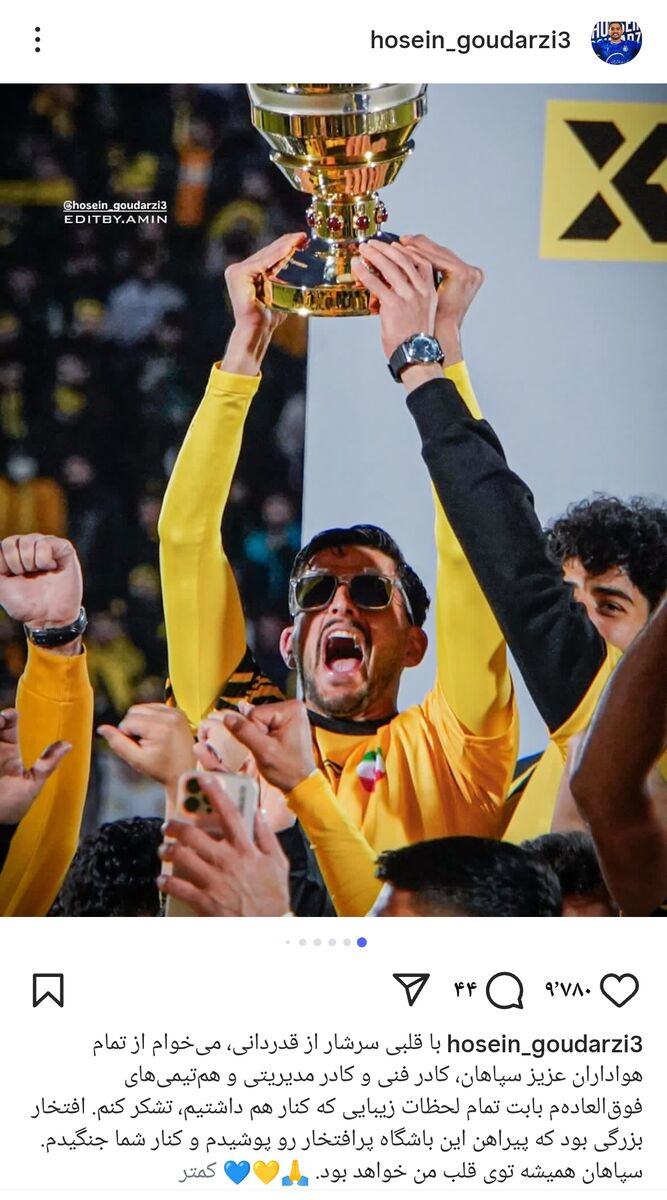 حسین گودرزی، مدافع جوان سپاهان، پس از جدایی از این تیم و پیوستن رسمی به استقلال تهران، در پیامی خطاب به هواداران سپاهان از آنها قدردانی کرد و خداحافظی خود را اعلام نمود.
